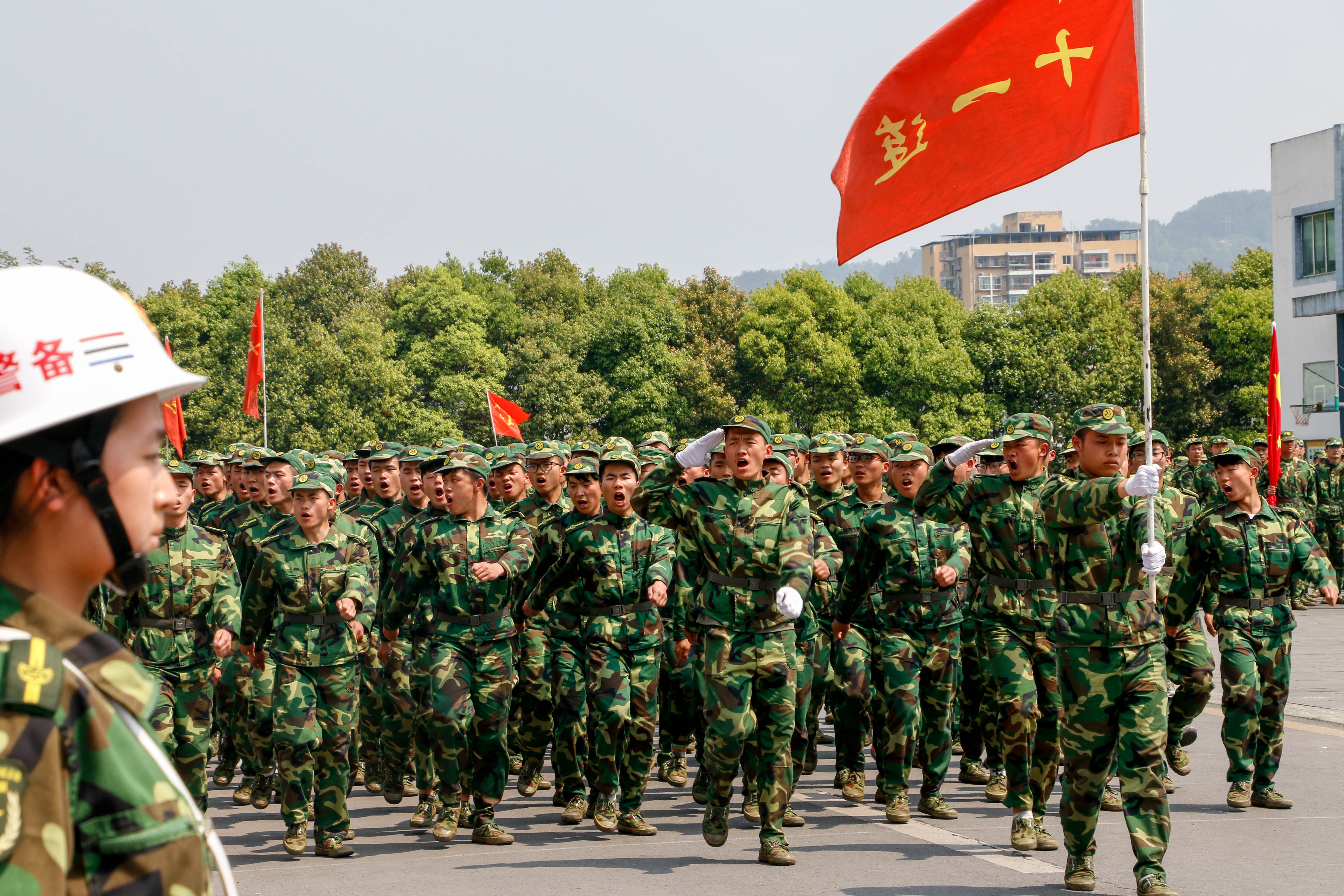 烈日炎炎,军训口号响震天。飒爽军姿展风采,体院学子现雄风。