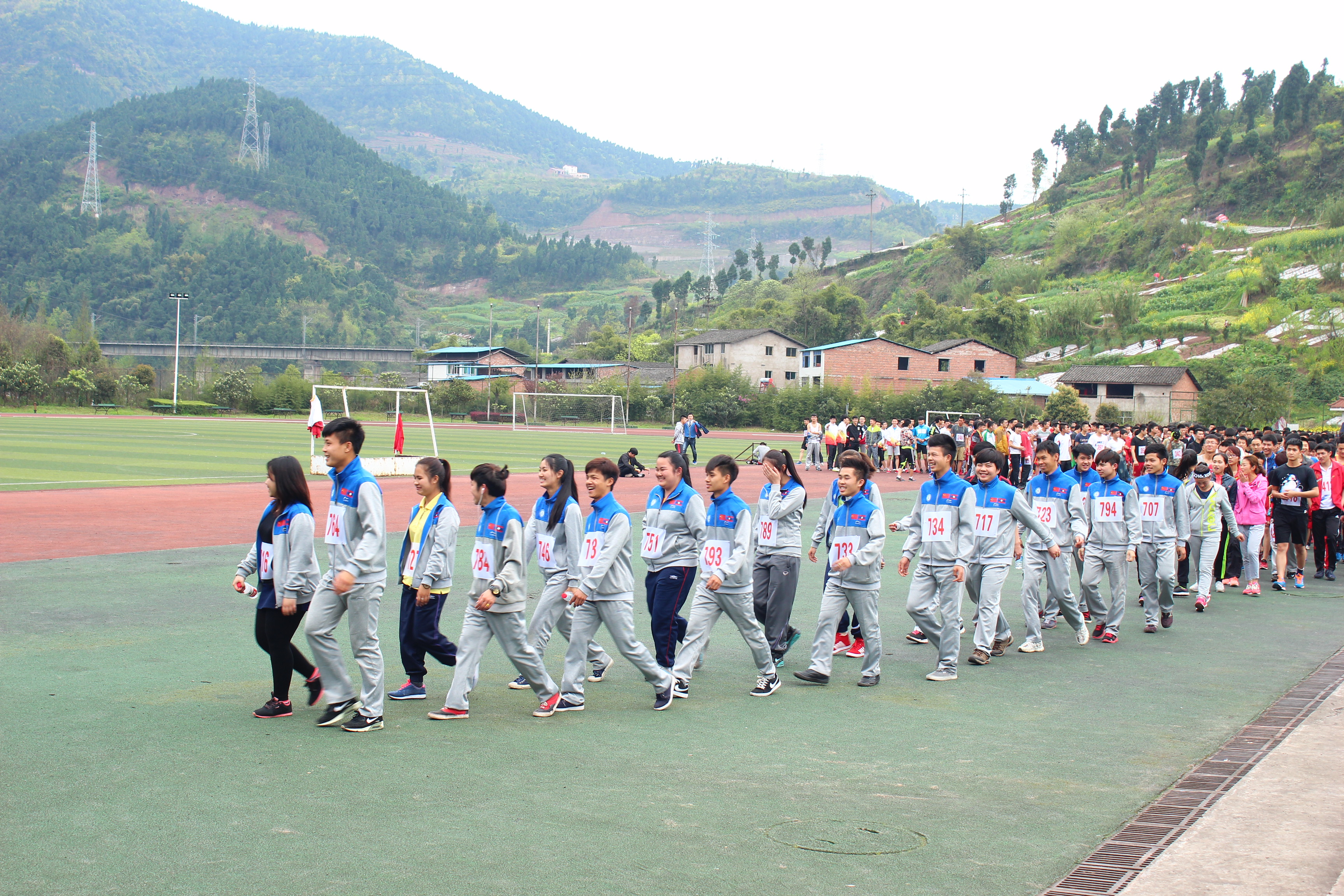 1500,所有参赛教师和参赛队员在行政楼前整队集合,随着体育公司党总支书记佘涛老师手中的一声枪响,近700名同学如离弦的箭一跃而出,他们个个身手矫健,志在必得。赛道途中,道路弯曲、坡度大,尽管同学们汗流浃背,气喘嘘嘘,但是他们个个精神振奋,激情昂扬。随处可见运动健儿拼搏的身影,公司员工们与老挝职工互帮互助的情景。比赛途中设有多个服务点,为比赛的同学们提供矿泉水,指引道路。本次比赛对同学们的身体素质、竞争意识、拼搏精神和心理承受能力都是一次严峻的考验。最终,20138班李攀同学、20136班马秀英同学分别取得了本次比赛男子组、女子组第一名。赛后,老师们为成绩优异的同学们颁发了奖品并合影留念。