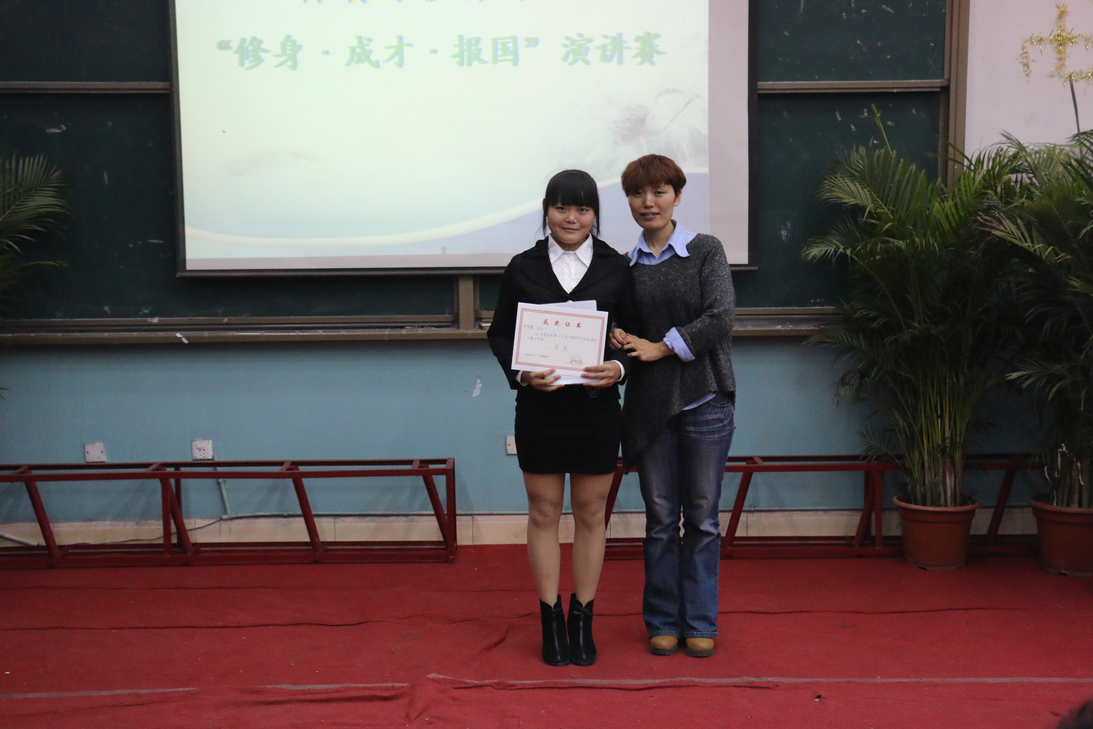 比赛中,选手们结合各自的亲身经历,紧紧围绕主题讲述着一个个不平凡事迹和感人故事。选手们慷慨激情的演讲,立志报国的誓言引起了在场观众的共鸣。经过一个半小时的激烈角逐,2014级6班李梦霞同学9 .45最高分荣获本次比赛一等奖。安秀华、谭毅同学荣获二等奖。最后,李霞、那明明老师为获奖选手颁奖合影。