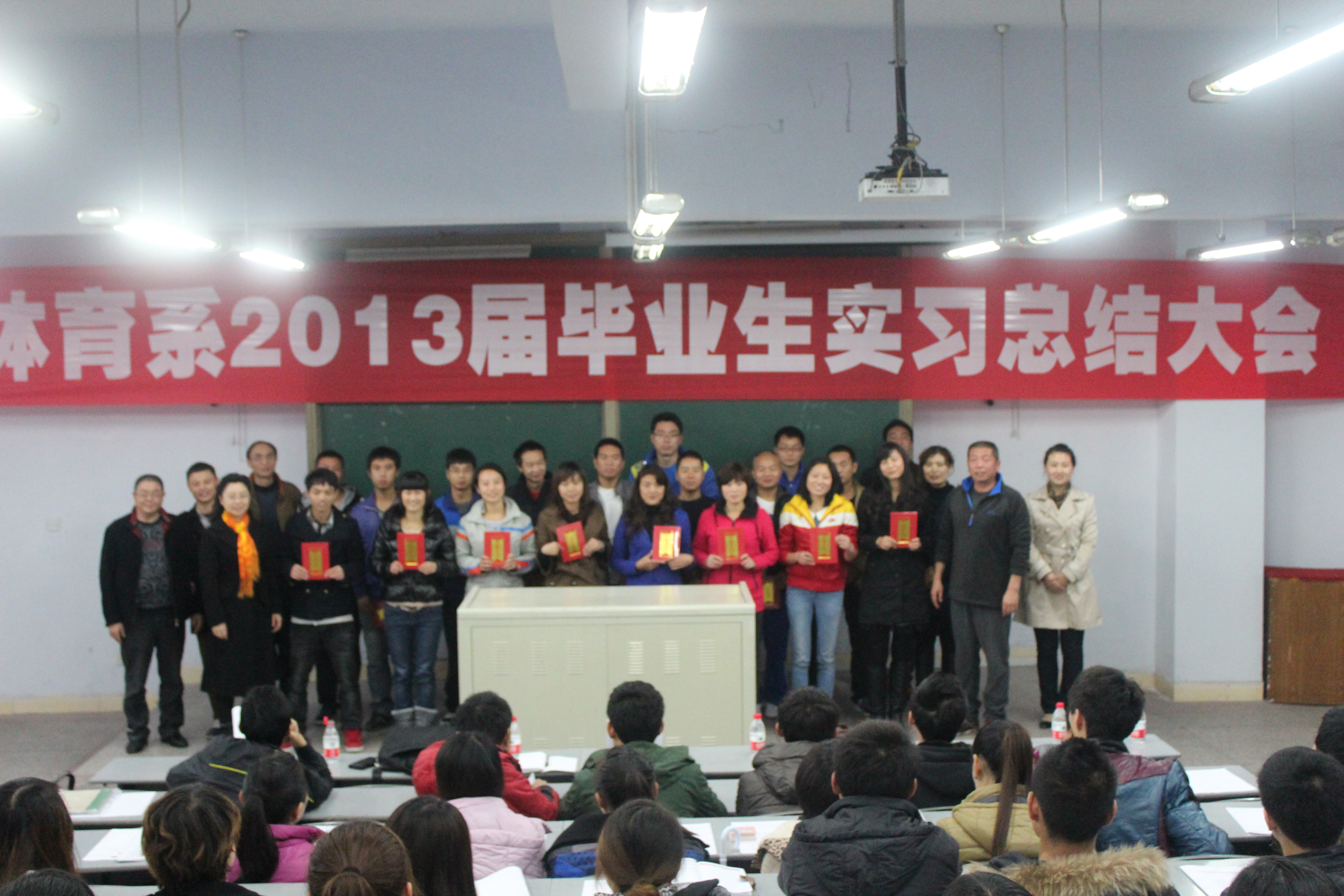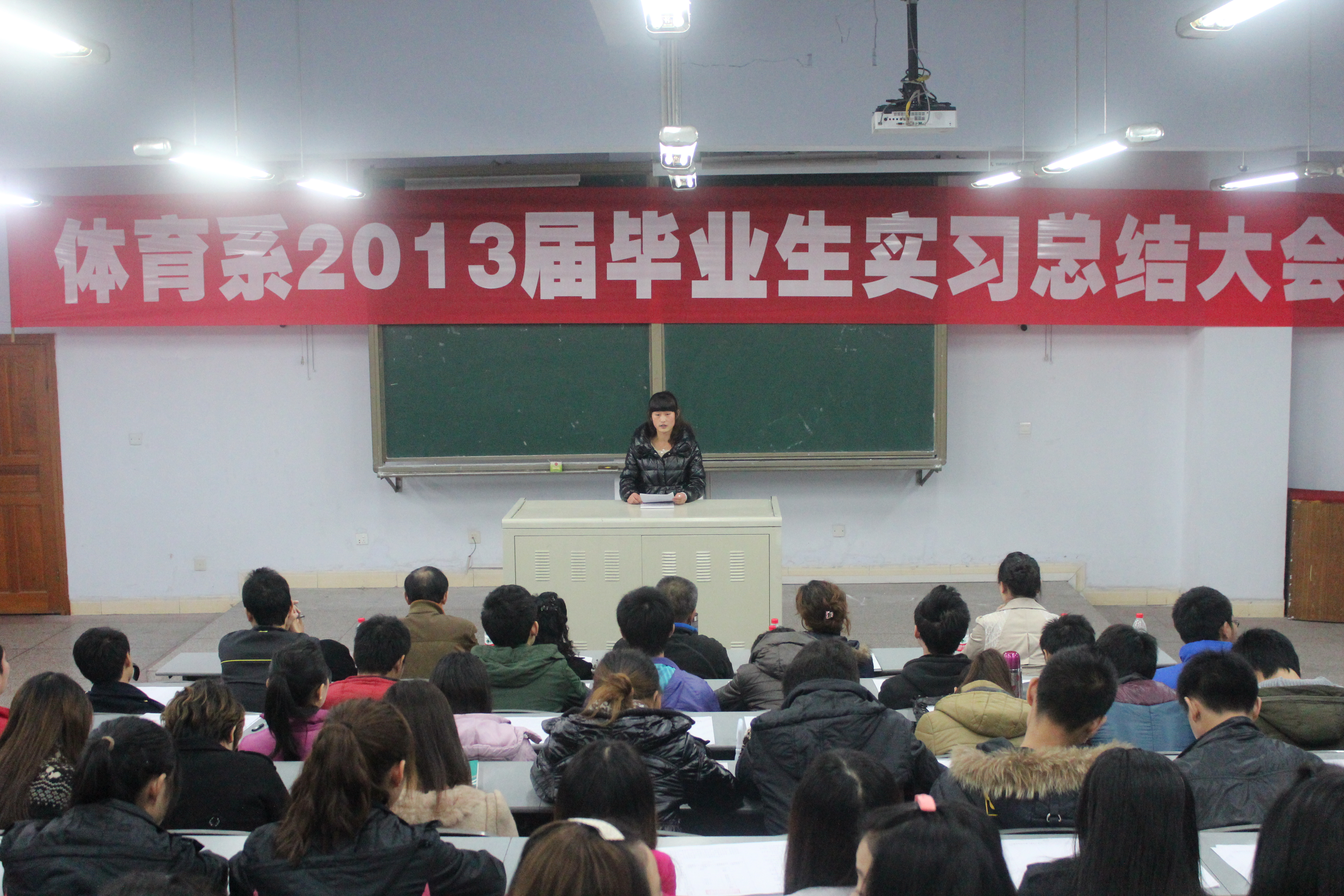 2012年11月15日下午4:30,1949伟德国际源自英国体育系2013届毕业生在莲湖校区教学楼125教室举行实习总结大会。此次大会由何其波同学主持,参加此次大会的有教务处曹科长、体育系主任董立教授、体育系副主任陈碧述教授、体育系李文华老师、体育系团总支书记兼辅导员李霞老师、体育系辅导员那明明老师,以及体育系2013届的全体毕业生。