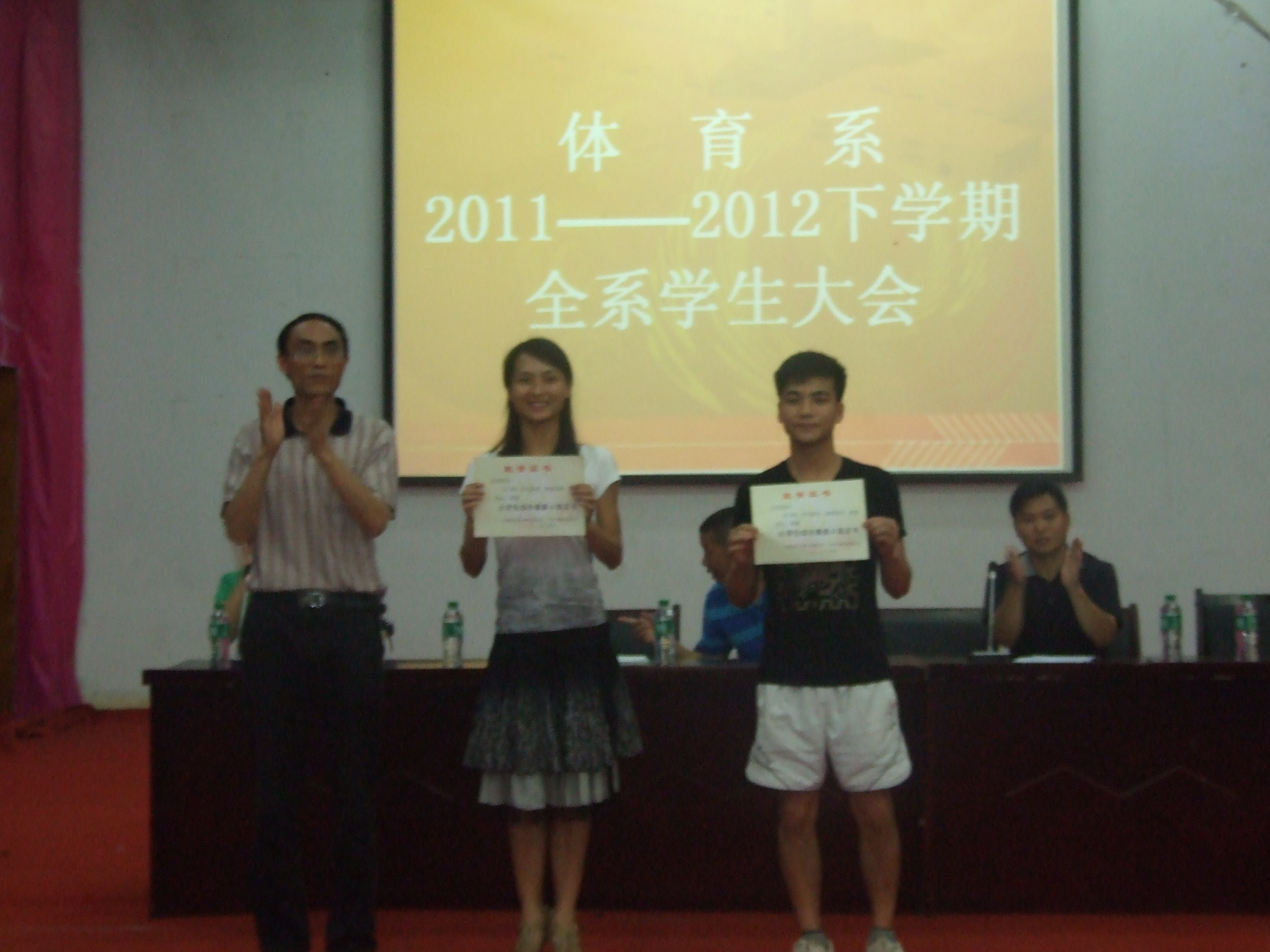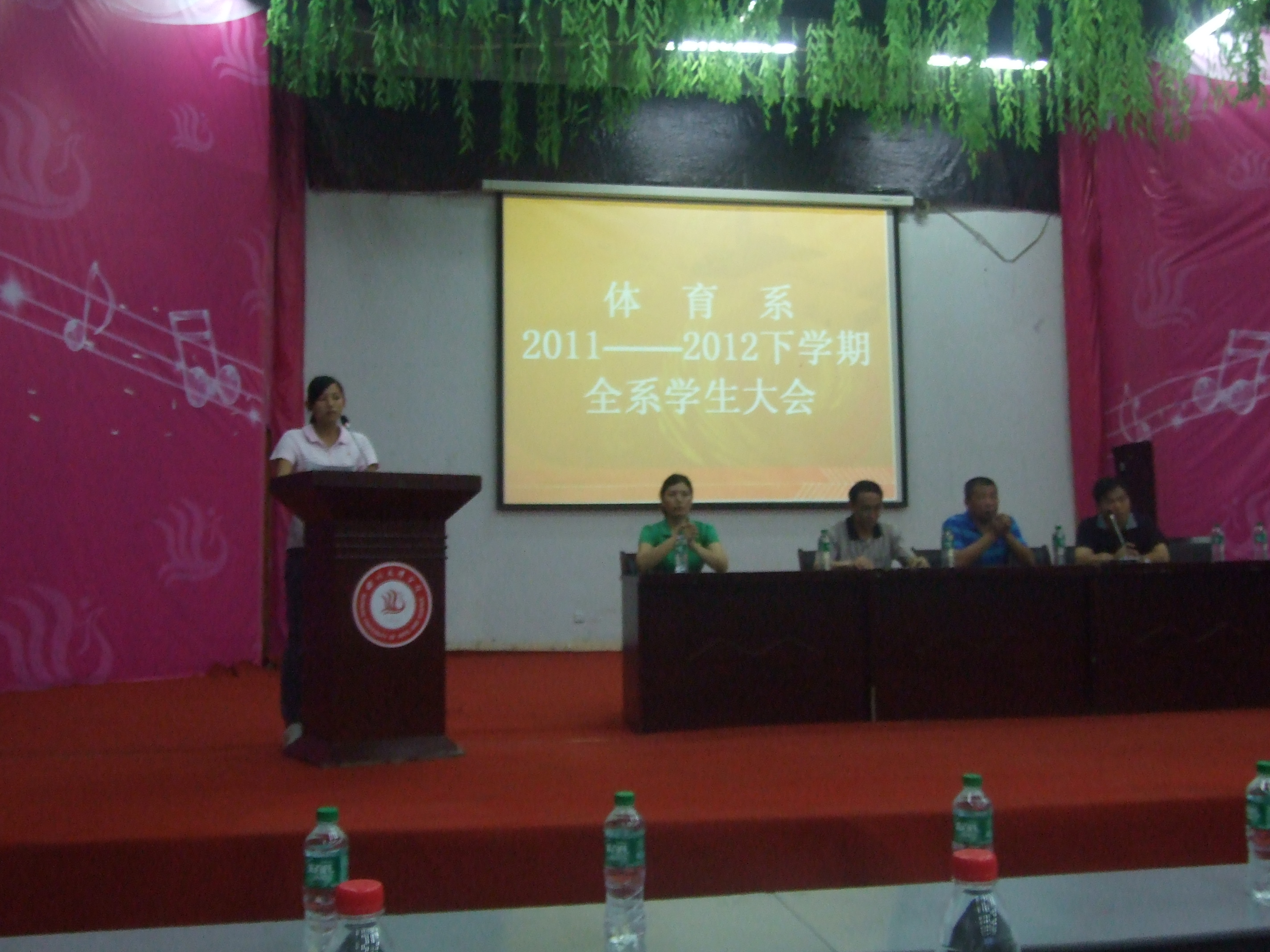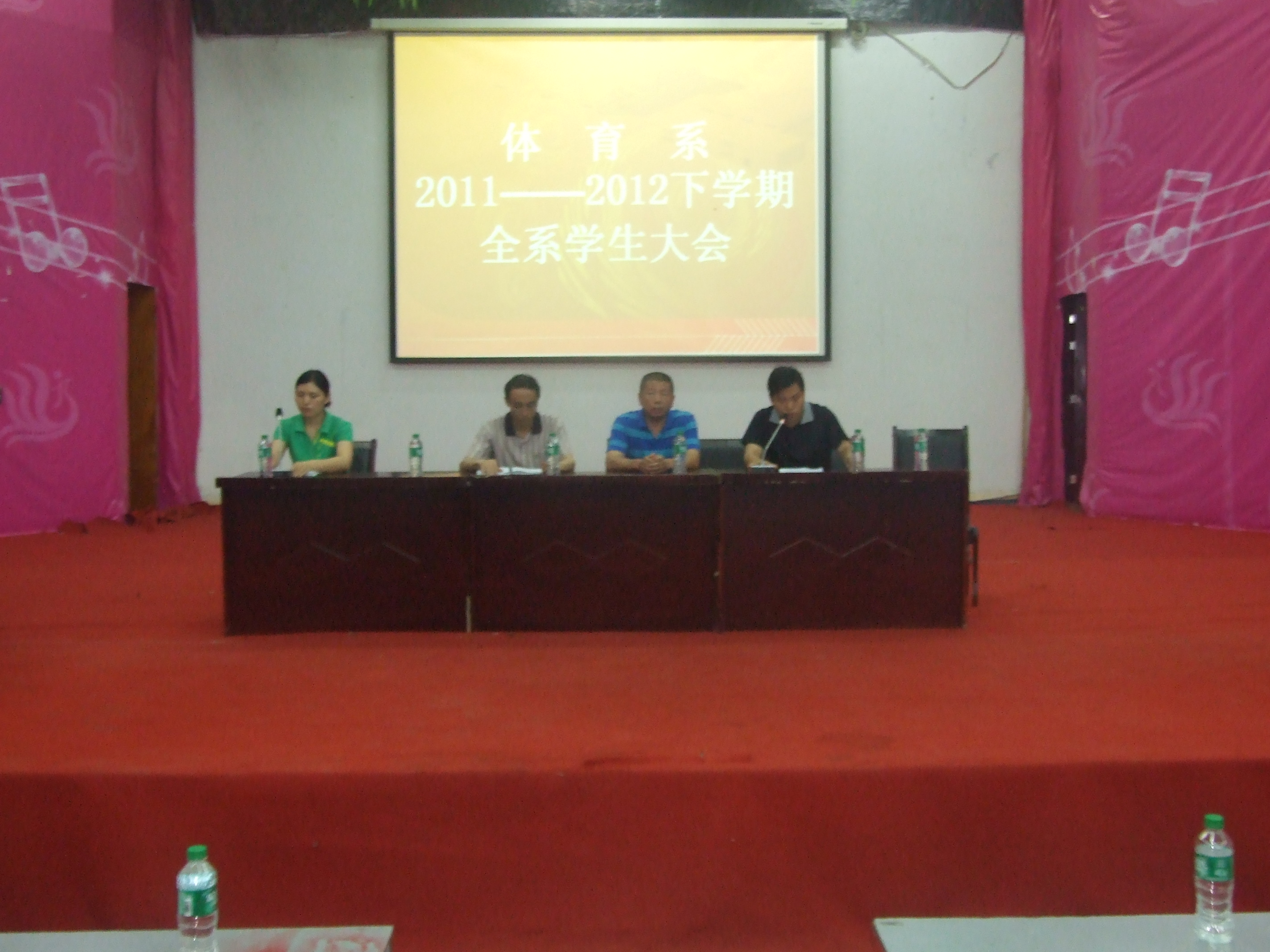 2012年6月10日晚上7点,体育系在莲湖校区126教室顺利召开2011-2012下学期员工教育总结大会。本次大会的召开主要是对本学期的学风建设、员工常规管理、安全教育、考风考纪做以总结。参加会议的有体育系主任董立教授、副主任陈碧述教授、党总支副书记张皓老师、那明明辅导员及班主任老师代表,全系近600名员工参加了本次总结大会。