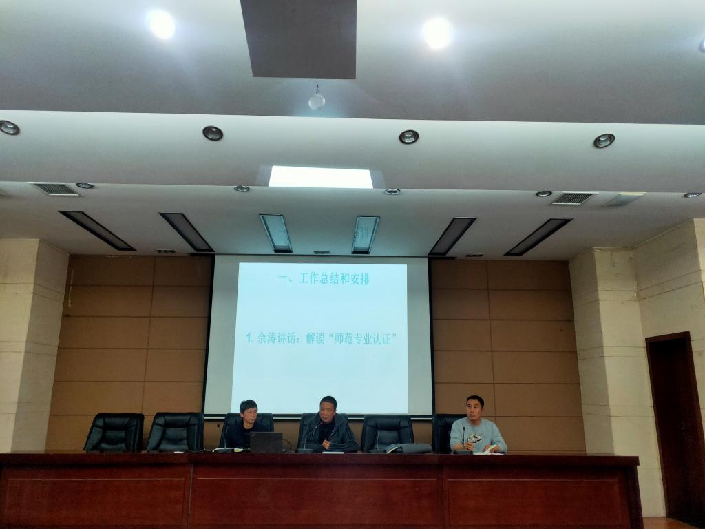 佘涛传达程董事长有关师范专业认证的讲话精神。首先,他介绍师范专业建设现状;其次分析现阶段存在的不足及改进措施;再从指导思想、工作目标、工作思路、建设认证对象、组织管理等五个方面解读了师范类专业建设与认证工作方案;最后,他强调全院师生要高度重视师范专业认证,要积极思考认证认识问题、需求调研问题、培养体系问题、质量保证问题、认证材料问题;同时要加快硕士学位授权点建设进度。