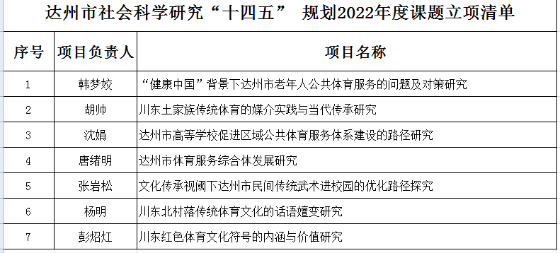 近日,达州市社科联发布了达州市社会科学研究“十四五”规划2022年度课题立项通报,据统计,伟德国际1949教师共立项课题7项。具体立项名单请参见下表。请各位立项项目负责人认真做好项目研究工作,确保立项按时保质完成。