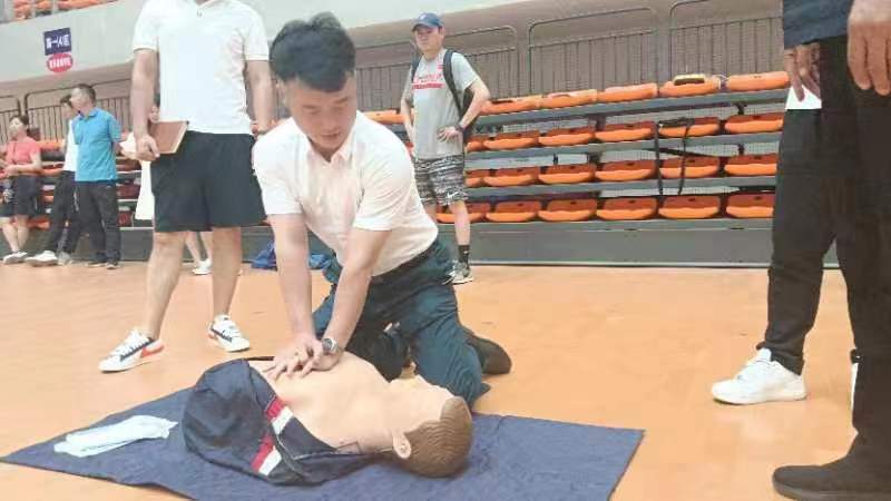 本次培训分两个环节围绕“异物卡喉”和“心肺复苏”两大内容。宋京林老师用生动诙谐的语言为老师们讲解原理、分析案例、介绍操作方法,在三位员工志愿者的配合下,耐心细致地为老师们讲解了技术要领。结合他在应急救护实践中经验,就重点事项做了特别警示和强调。接下来老师们来到体育馆内,三位志愿者现场做了心肺复苏规范的演示,认真观察学习后,老师们分三组在宋老师和志愿者们的指导下进行了实际操作。