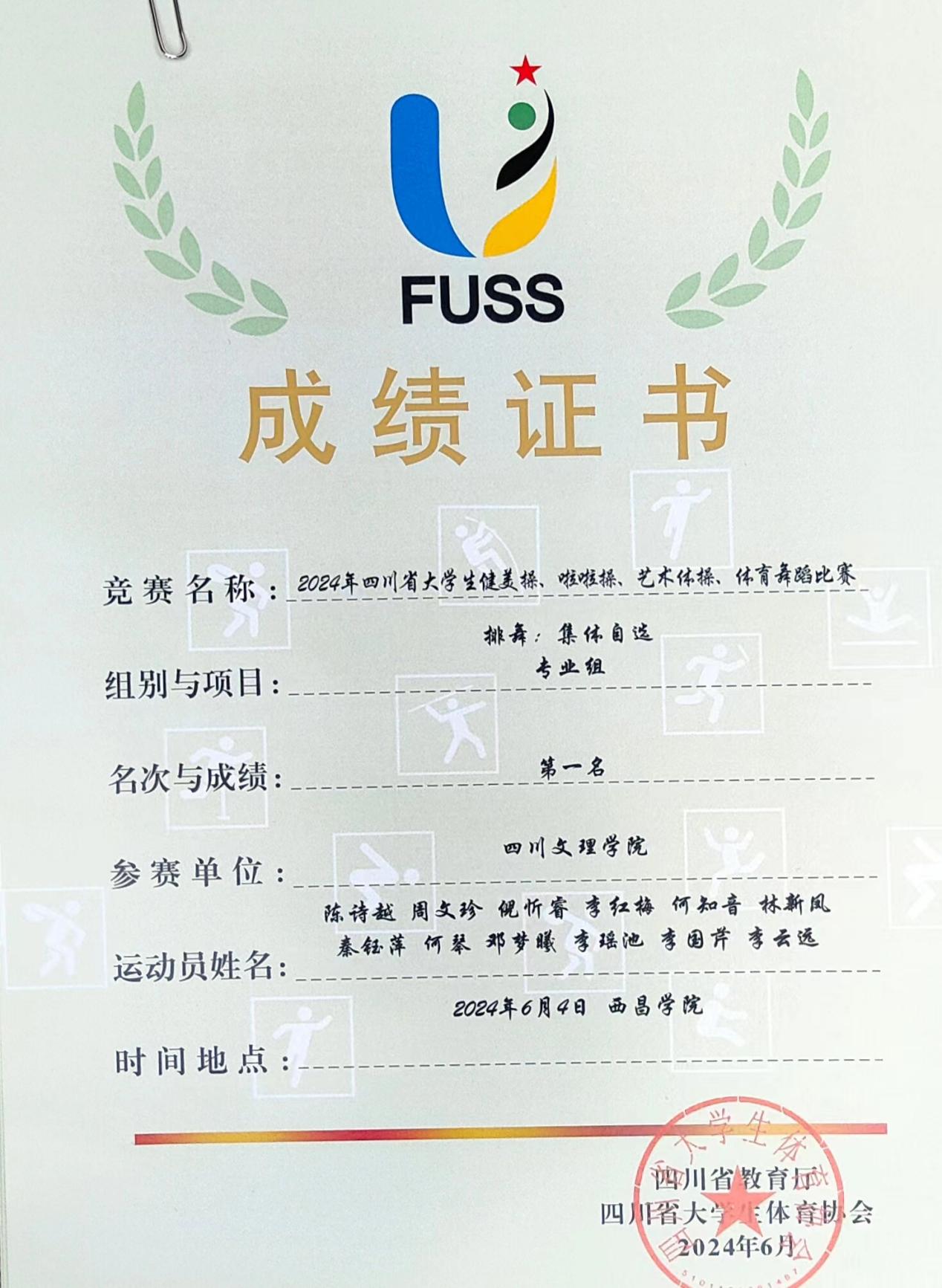何琴,秦钰萍、倪忻睿、周文珍等12位同学,在与四川大学、成都师范公司、西昌公司、阿坝师范公司等公司同台竞技最终获得体育院校专业组,排舞自选曲目第一名。