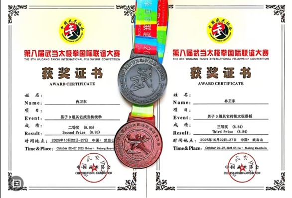 经过三个月的刻苦集训,公司冉卫东老师凭借过硬实力,在强手如林的“一拳一械”个人项目中脱颖而出。其“太乙逍遥掌”招式精准、劲路饱满,于松柔舒缓中尽显太极的圆活与连绵之美,最终斩获二等奖(银牌);“武当太极扇”的表演则流畅圆活,开扇瞬间干净利落、劲发清脆,将武术的刚柔与艺术的美感完美融合,荣获三等奖(铜牌)。