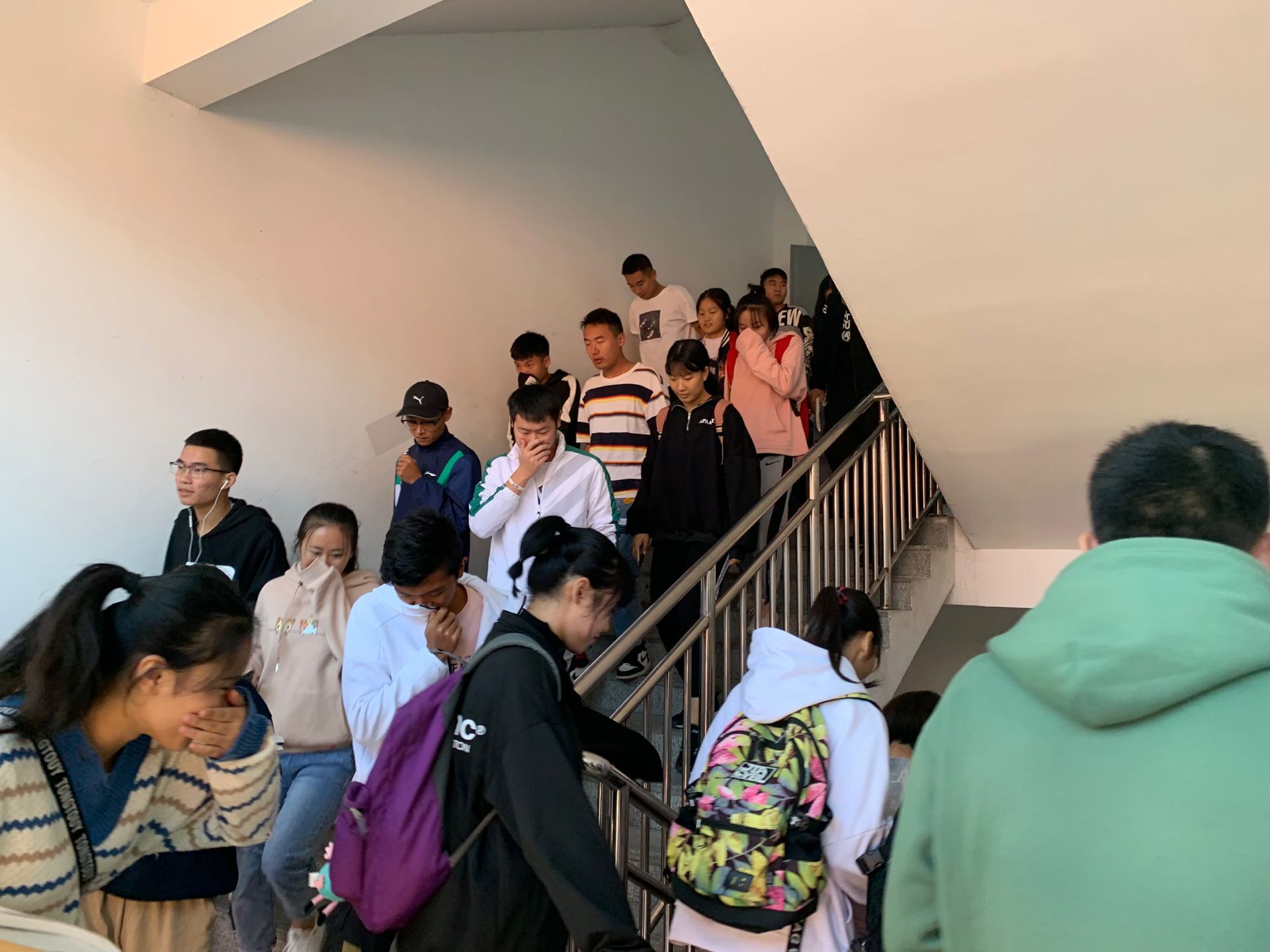 本次演练模拟同学们在文传楼四楼上课,教学楼突然失火,全体同学警急撤离的情景。12:10,火险警报拉响。同学们用衣物捂着嘴,府身小跑,有序撤出教室,走出教学楼,顺利地在天桥下集中,耗时2分52秒。