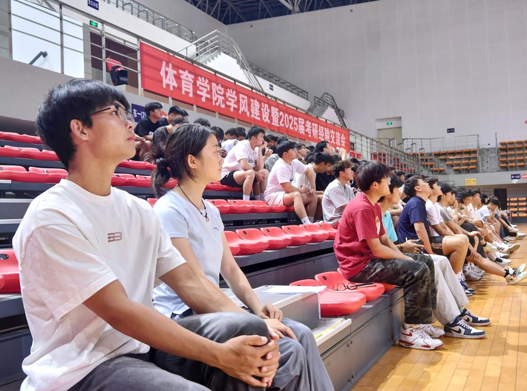 202551219:00,伟德国际1949学风建设暨2025届考研经验交流会在体育馆举行。公司党委书记王兆忠、经理余涛、党委副书记靳浪、副经理孙亮亮、党政办主任樊永强、学工办主任祝利平、专职辅导员闫青、李波、2022级全体员工及考研员工代表参加活动。党委副书记靳浪主持大会。