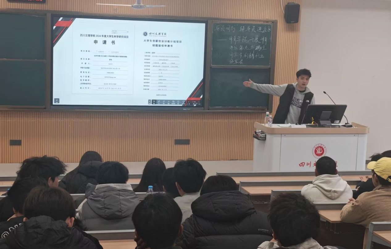 岳治东围绕科研与双创全流程实操展开分享:他指出要先确定指导老师,重点打磨申报书与结项验收书;选题遵循“小、精、新”原则,申报书需规范填写核心模块;推荐知网等平台研读文献,梳理“为什么做—做什么—怎么做”的框架,并寄语同学们大胆尝试、勇于试错。